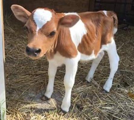 Mini Jerseys are much smaller then standard Jerseys. This is our Katydid. She was teeny tiny, just 19" at the hip at birth. Click the picture for a video of her playing with Spice, a standard Jersey heifer of the same age. Quite the size difference.